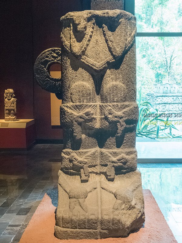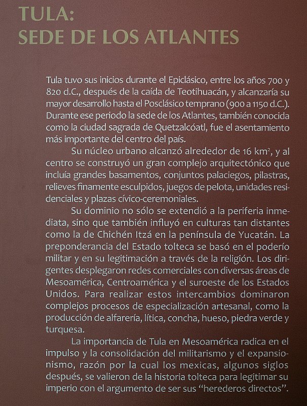 AtlanteTula900 - 1250 ADOnly 80 cm de haut et conservant ses pigments d'origine, cet atlante était probablement utilisé pour supporter un autel. Il représente un guerrier et porte une cuirasse et un collier de même conception que ceux de droite.
