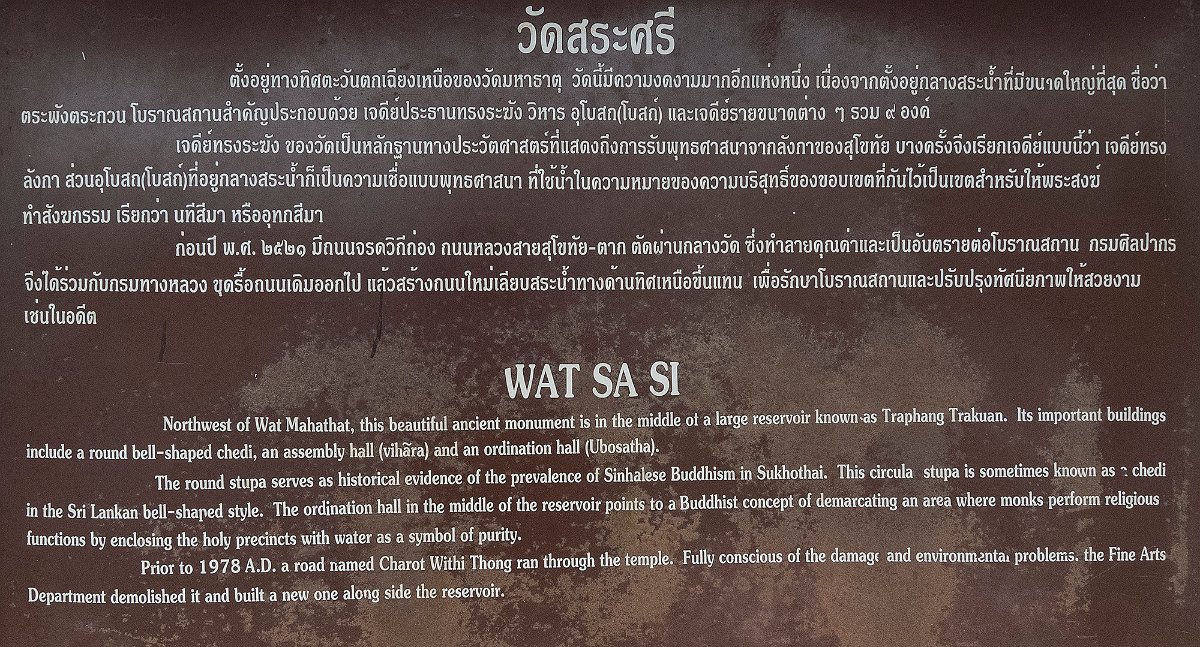 Wat Sa Si possède l'un des plus beaux endroits de Sukhothai .Ce magnifique temple trône au milieu d’un petit étang artificiel. On y accède grâce à un petit pont. On peut y observer des pierres en forme de pétales de lotus qui délimitent le hall d’ordination ainsi qu’un chedi d’inspiration sri-lankaise. On peut également y admirer un immense bouddha ainsi qu’un plus petit bouddha noir en marche.