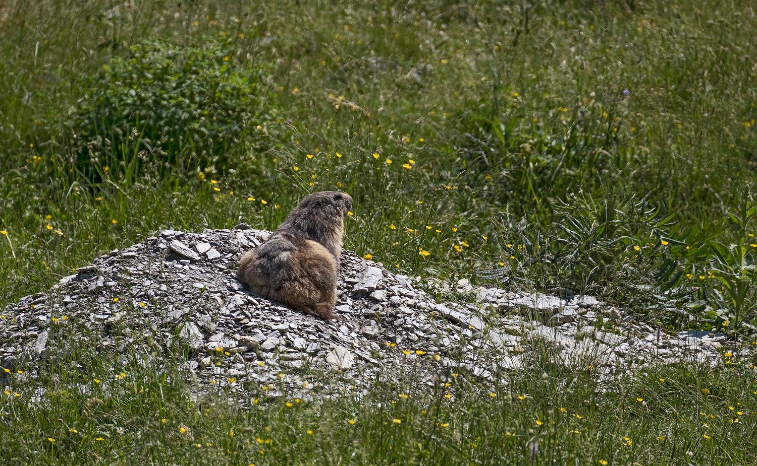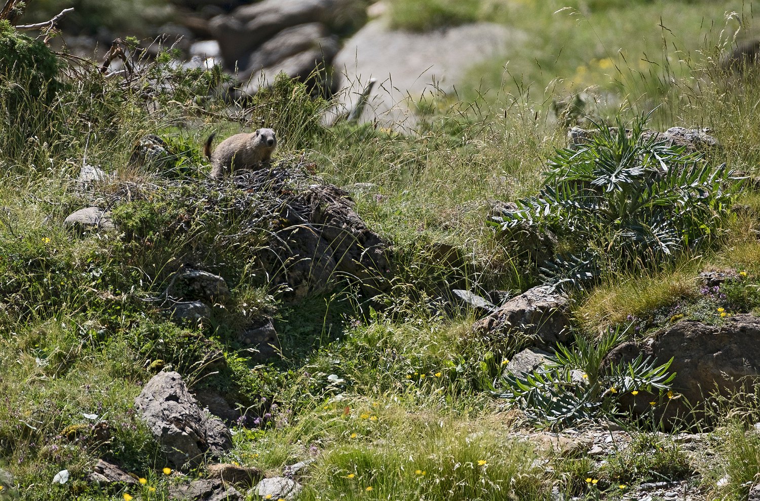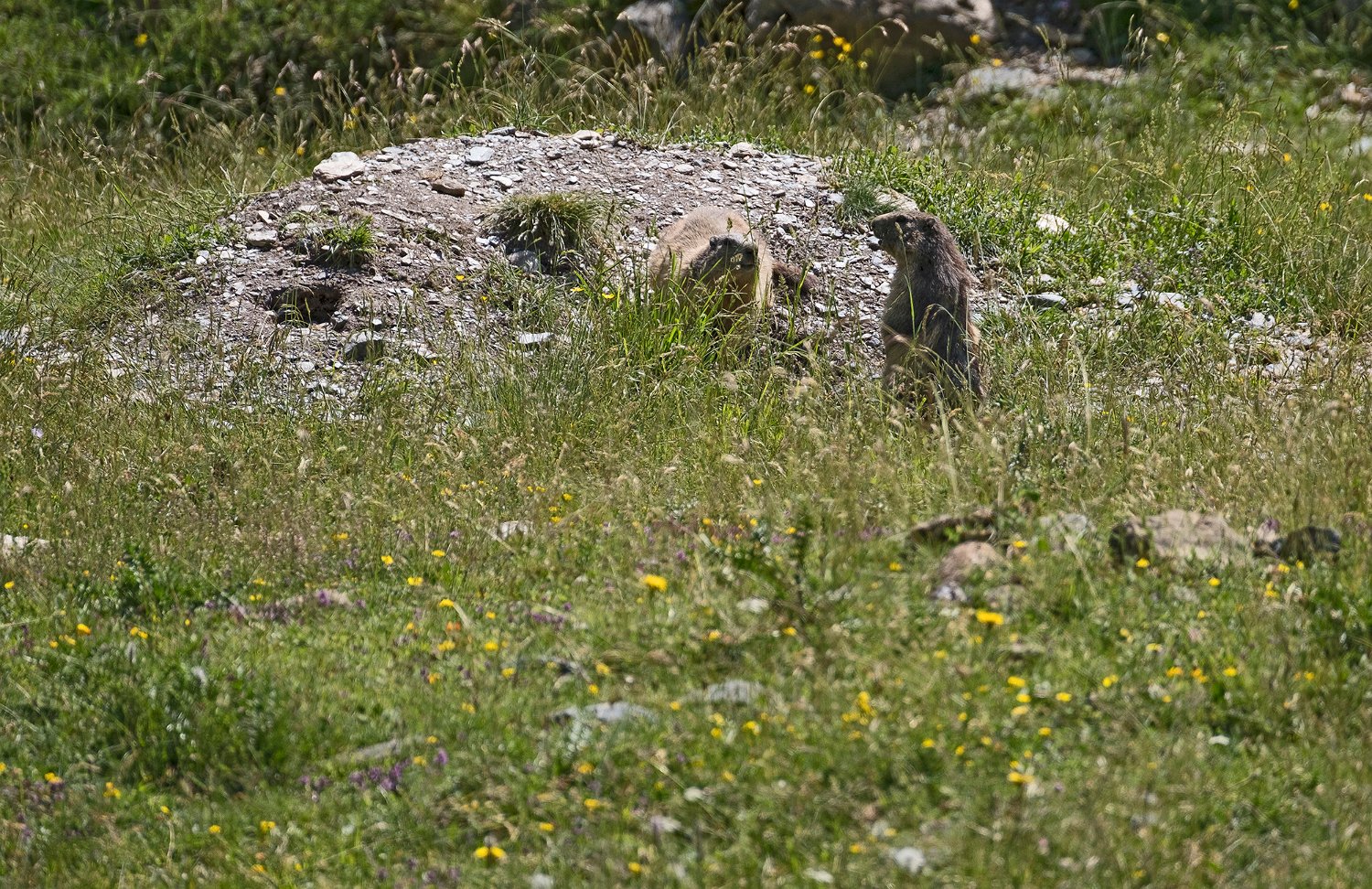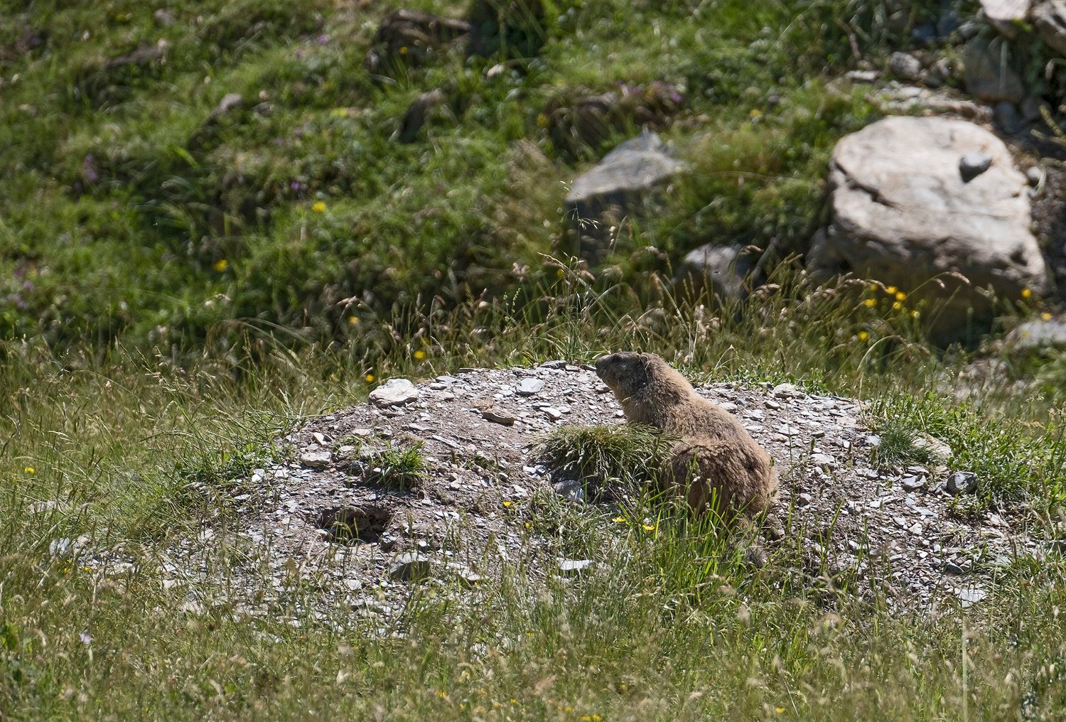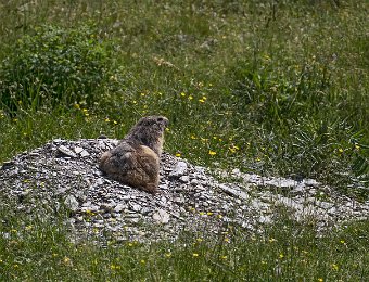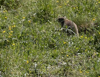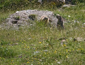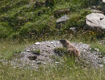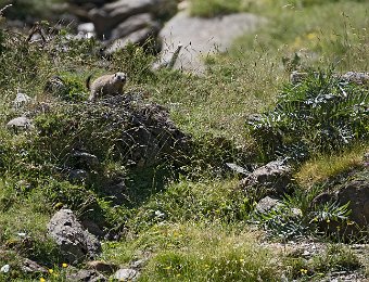 Mais les habitants les plus surprenant de la jasse sont les marmottes. Ici une sur la défensive à l'entrée de son terrier ...