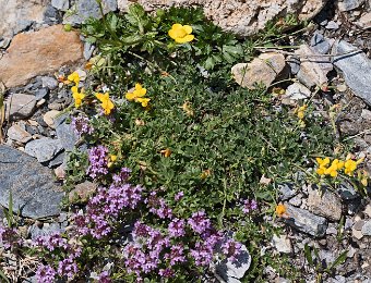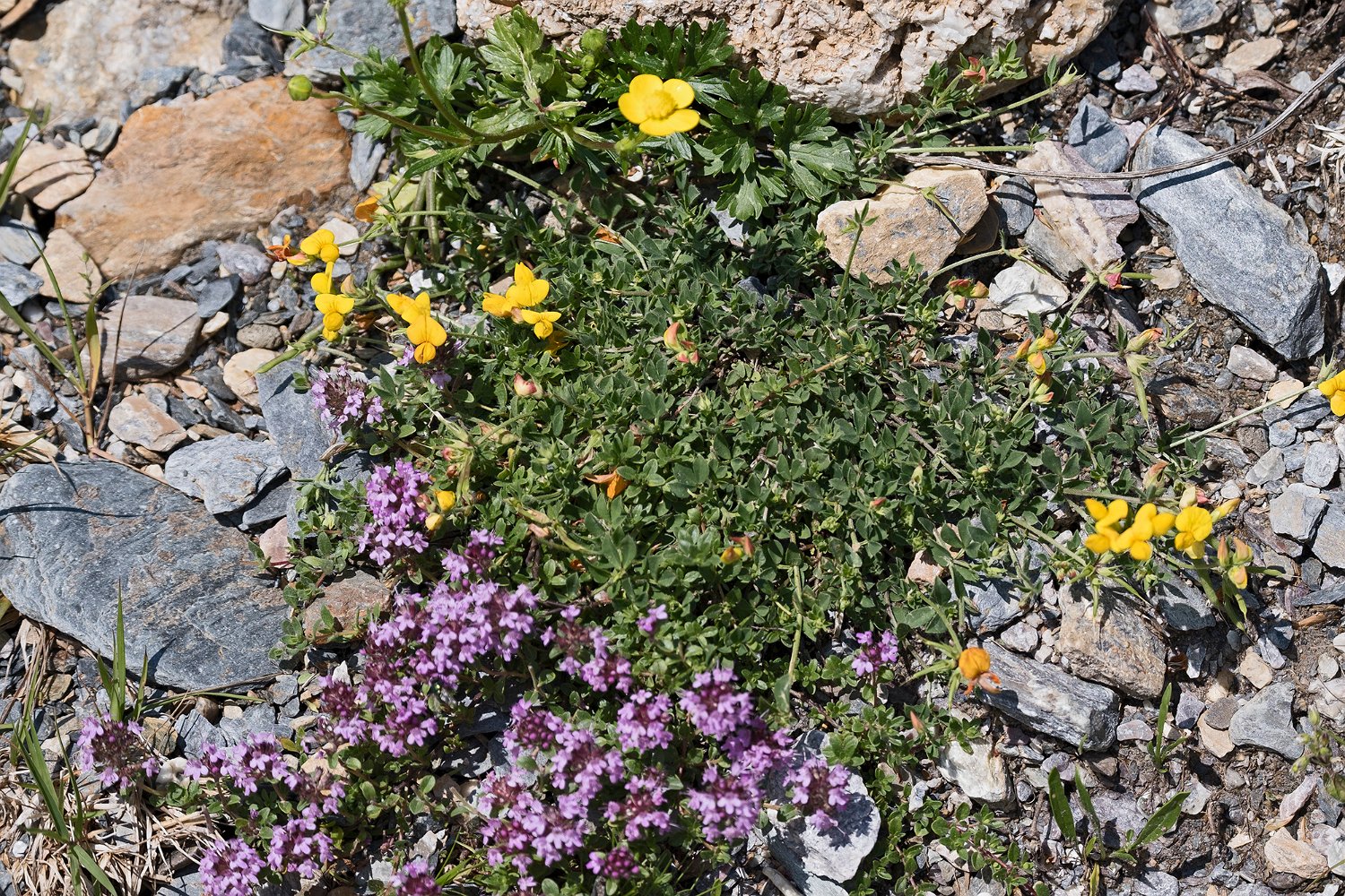 Des plantes qui s'adaptent aux milieux rocailleux (lotier, renoncule rampante et bruyère)