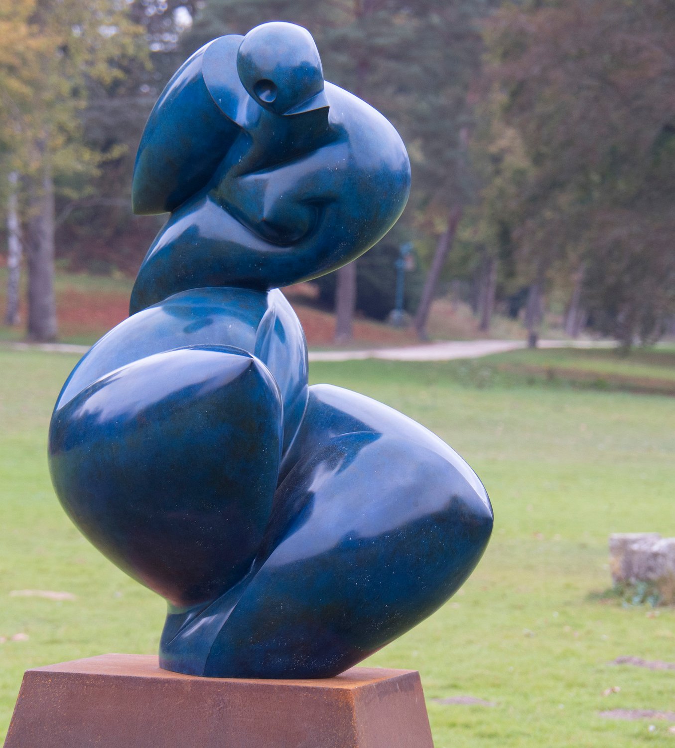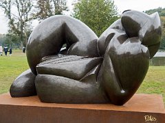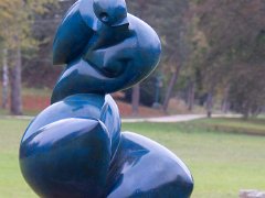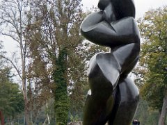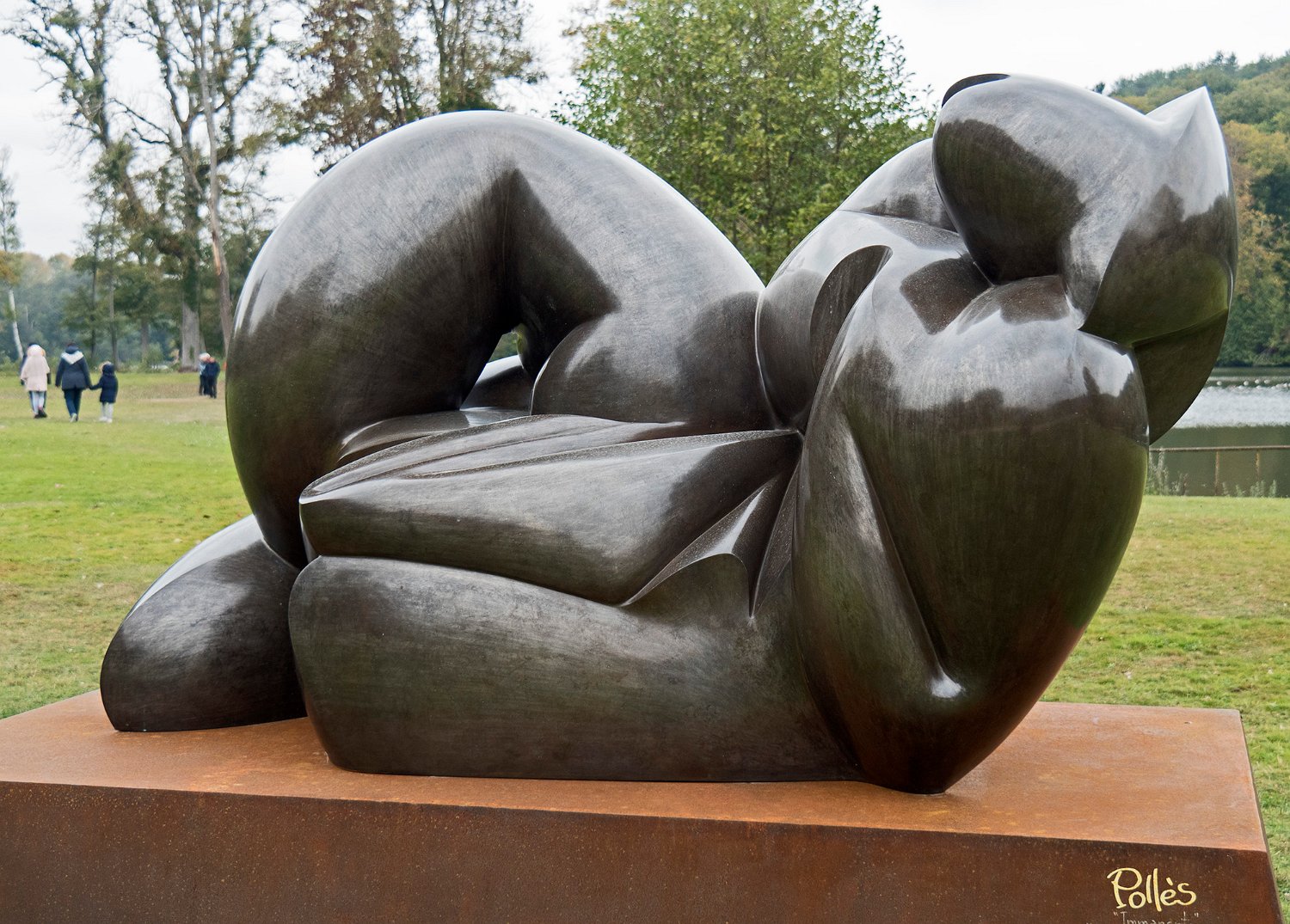 Vue d'ensemble de l'abbaye depuis l'étang. Au premier plan une sculpture de Pollès.