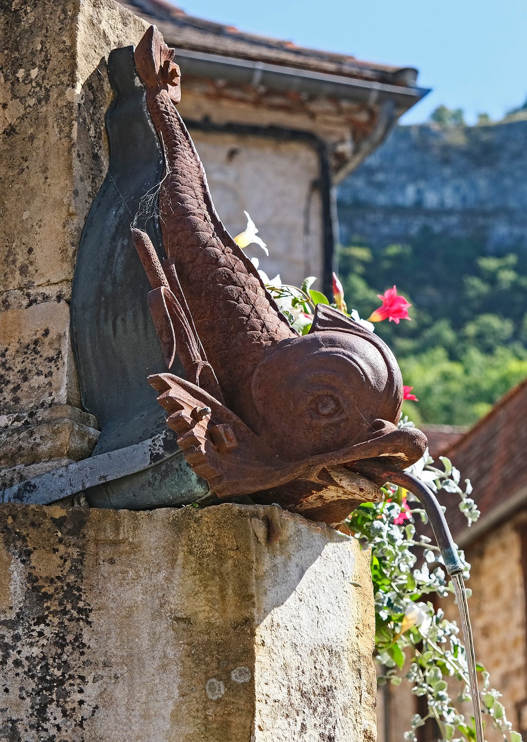 La fontaine du centre du village ornée de dauphins de broze