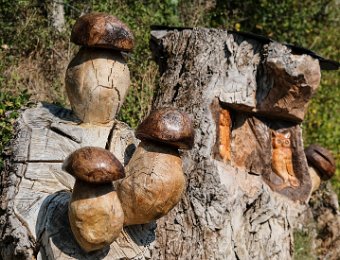 Scultures sur tronc en place à l'entrée du village