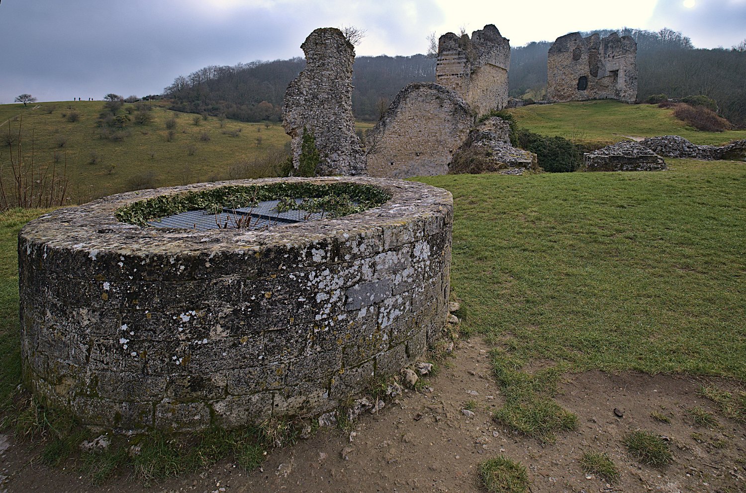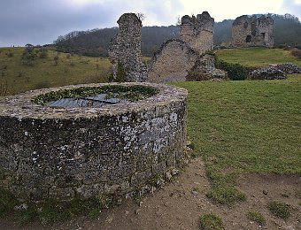 L'enceinte du donjon et le donjon au centre, à gauche la basse cour et le puits
