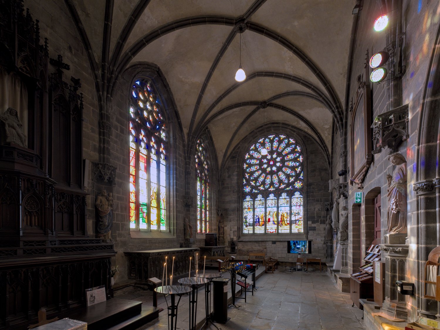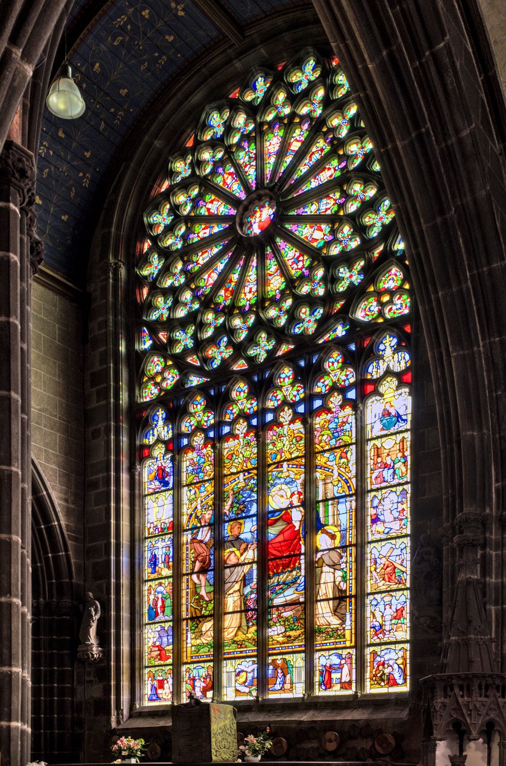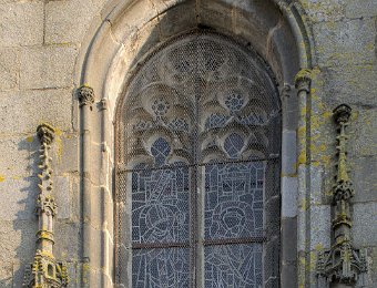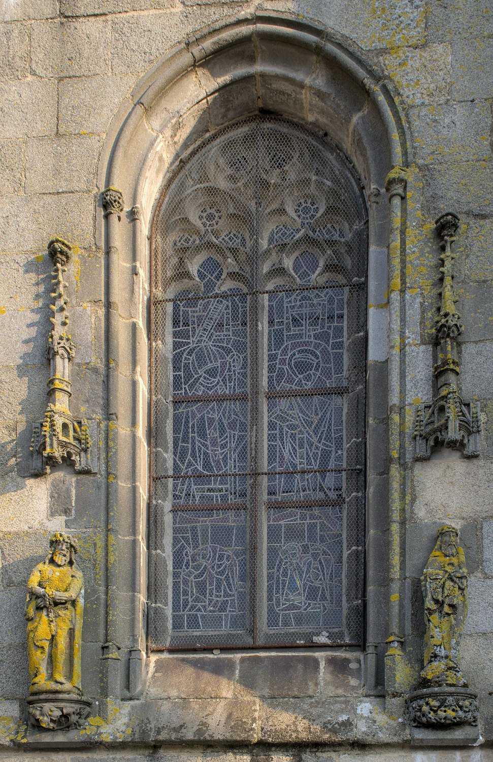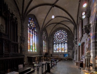 Chapelle de Coetivy- vitraux, au fond le vitrail du couronnement