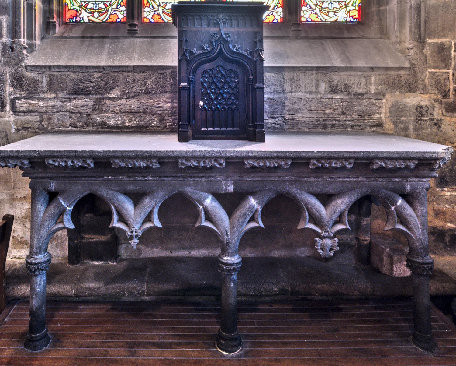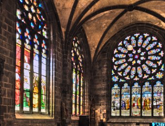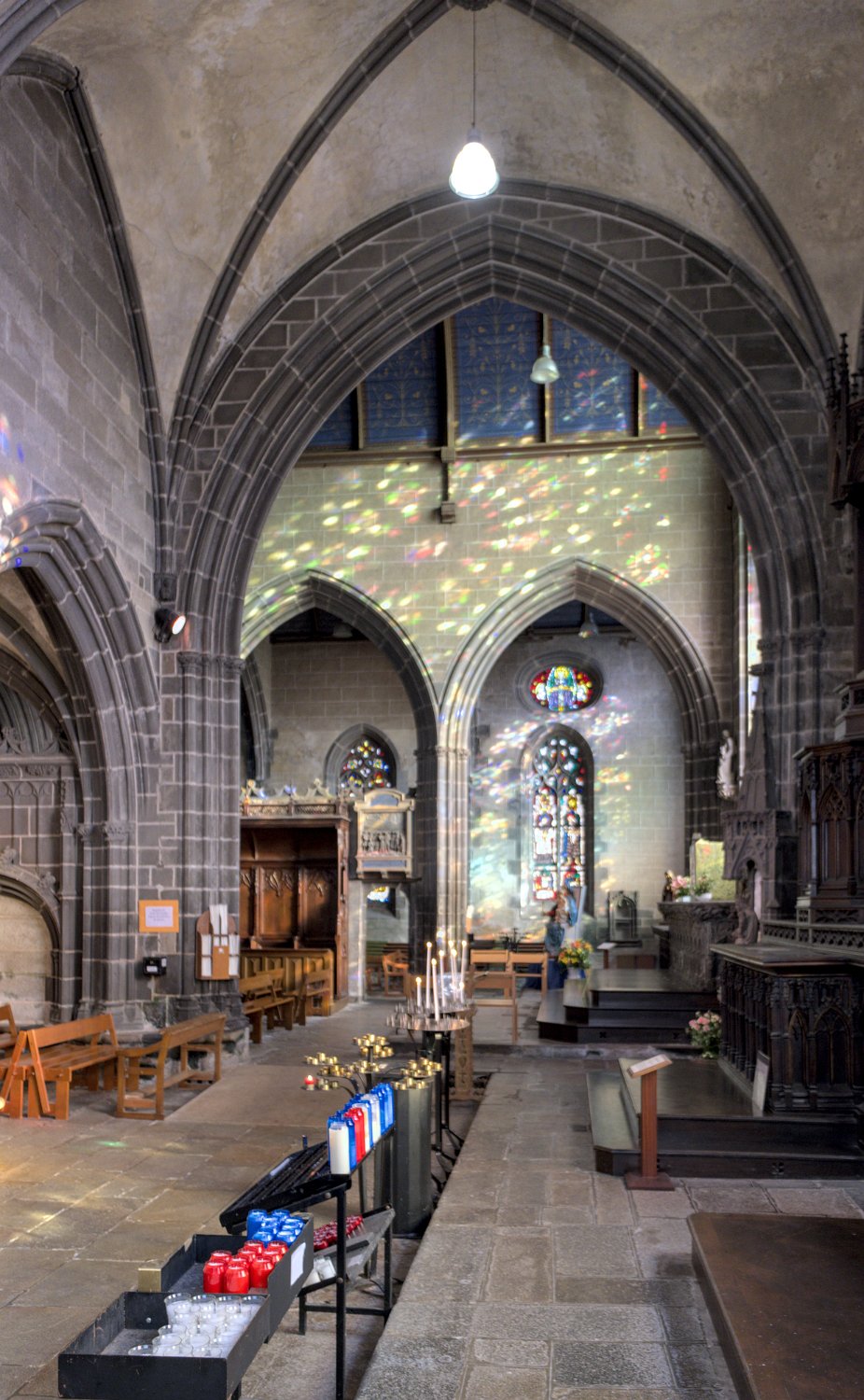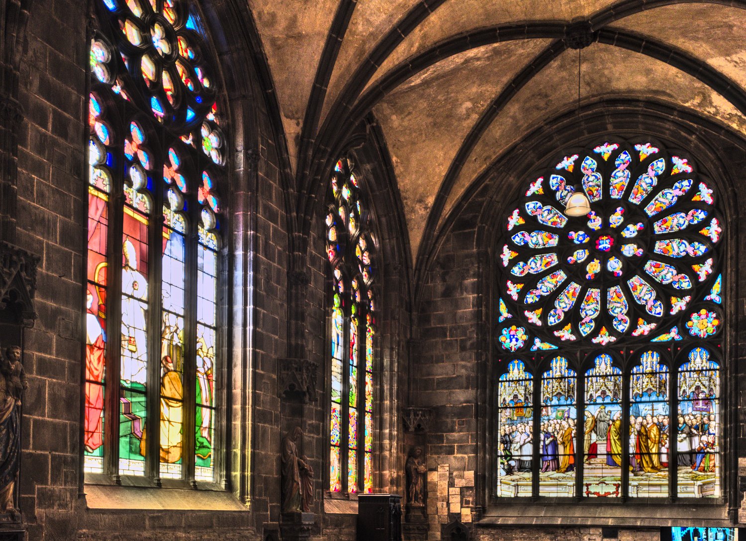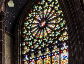 Chapelle de Coetivy- vitraux, au fond le vitrail du couronnement
