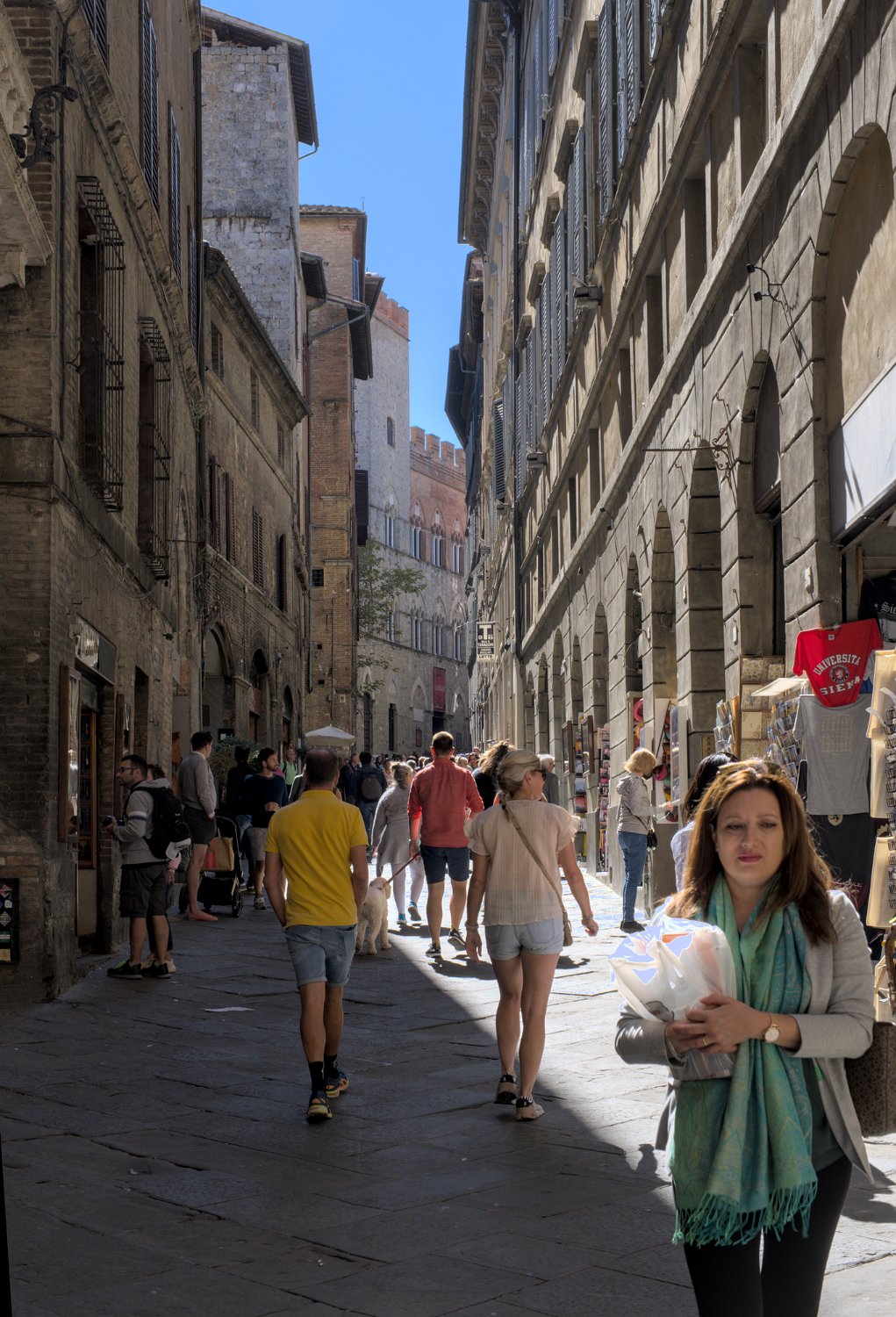 Les rues et les places de Sienne sont bordées loggias renaissance, de palais privés, d'églises baroques et de vieilles maisons en briques rouges. La Via di Città autour de la Piazza del Campo est la rue principale de Sienne avec de nombreux commerces.